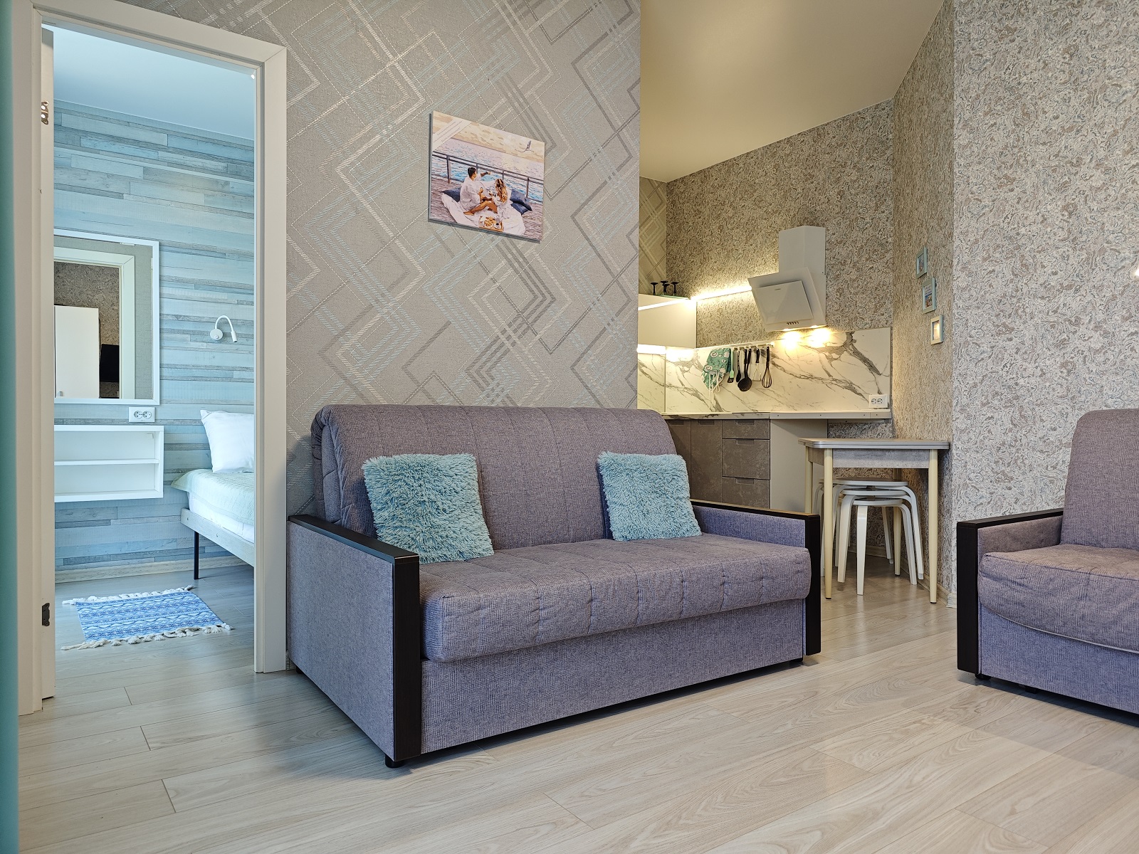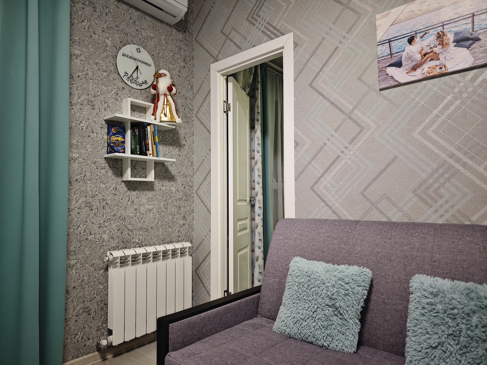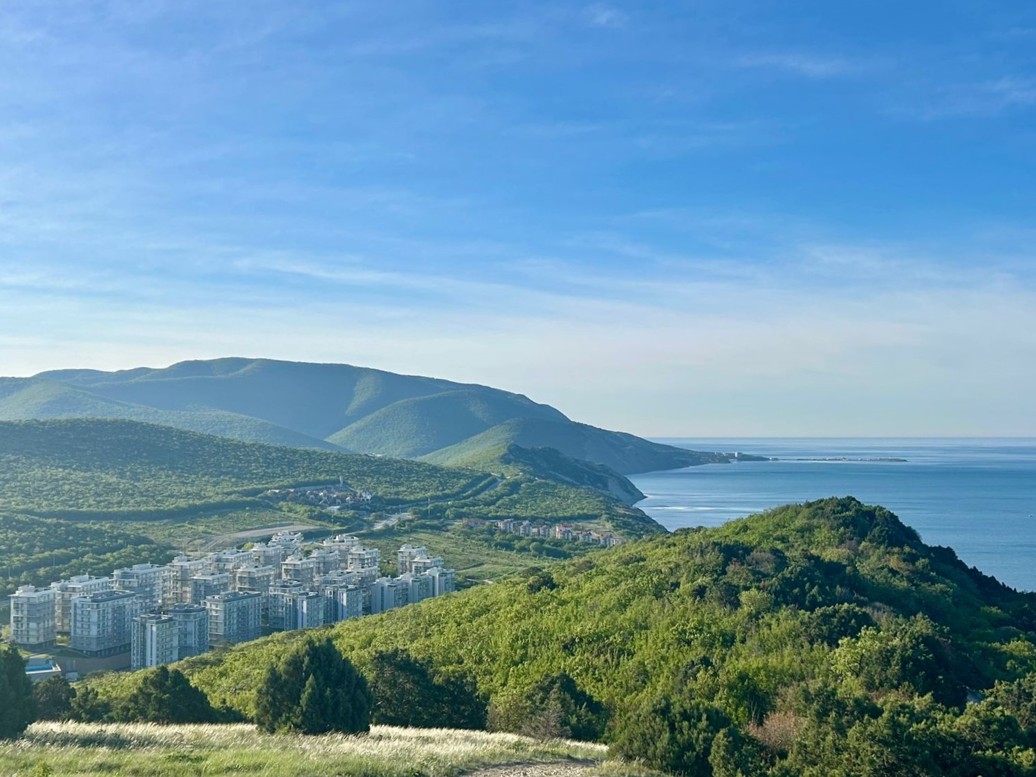Компактная евродвушка в новом ЖК «Анаполис», в 300 м от моря. Все домашние привычные удобства (и даже больше), стиральная машина, Wi-Fi, красивые виды. Уютная, новая. Окна в пол — смотрят на гору с можжевельником и слева море. Двуспальная кровать с ортопедическим матрасом в спальне. В гостиной диван- и кресло-кровати. Вмещает от 2 до 5 человек.